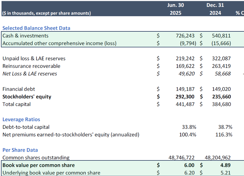 Skyway is showing material growth by all measures with quote to bind stepping up in the first half of 2025. The company noted that the step up from 28% to 45% from January to June was a combination of some seasonality activity peaking in the summer months ahead of the June renewal period. In addition, the business felt the higher quote to bind was also partially attributed to the knowledge and associated confidence in what risk is worth taking on. On the call, management noted a goal of $20M of premiums for their Skyway product and while they are in no way forced to hit that goal being that underwriting quality is so important, we still think they will achieve this figure.