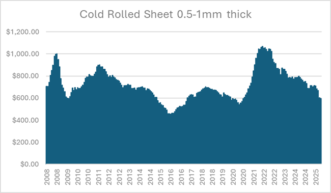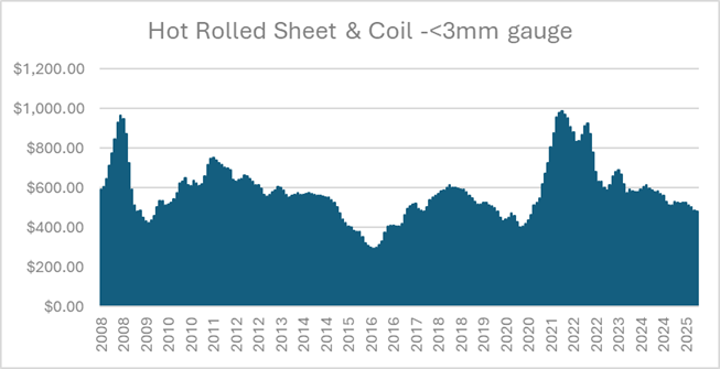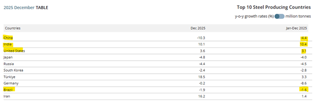 For 2025 the world produced 1.8B tons of crude steel which was a 2% decline vs the 2024 figures. Importantly, Chinese production though it was over 50% of world production (960M tons) was down 4.4% from the 2024 levels. China has been the swing producer of steel for some time and has been the cause of the deep recession we have experienced in steel worldwide. Not only did China over build steel stocks prior to the COVID crash but these effects were exacerbated by the consumption of steel in China declining as their real estate & construction sectors blew up post COVID.