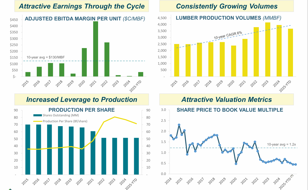 One of the things we watch with a number of industries we invest in is the willingness to tighten supply further. North American lumber as a whole has been reducing supply over the last number of years with Interfor shipping 978M board feet in the quarter and reducing inventory volumes by 37M in the quarter. When lumber shipments exceed production that is a tea leaf we like to see when thinking about when the turn might begin. We expect to see flat to declining production with more curtailments overtime industry wide as North American lumber remains difficult amid a host of macro headwinds.