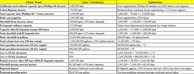 Given that California’s working gasoline inventories typically cover only 15 to 20 days or 720 million to 960 million gallons a 100-day El Segundo shutdown would consume more than 1.24 billion gallons, far exceeding existing stocks and leaving the state swimming naked with no supply buffer. Assuming partial recovery over 150 days, with El Segundo regaining half its capacity, the state would still operate about 4% below demand, leaving minimal spare capacity and extreme vulnerability to additional disruptions from fires, mechanical failures, or other unforeseen events and would send prices soaring.