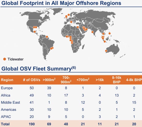 Tidewater is the owner of the largest fleet of Offshore Support Vessels (OSV) in the world with 190 vessels across Europe, Africa, Middle East, Americas, and APAC. OSV’s complete two major functions in what the business calls Conventional Services & Harsh Environment Services. Conventional Services includes transporting and supplying offshore materials, anchor handling & positioning for towing, construction support, well stimulation, seismic support, etc. The other piece of the business is Harsh Environment Services which deal with waters such as Greenland, the North Sea, or Canada and include oil recovery operations, rescue operations, polar code compliant vessels that are equipped with winterization capabilities. The vessels Tidewater owns are very versatile and about 60-70% of the work they do are what the company refers to as a “milk run” where they are moving materials and people around the ocean to support critical infrastructure projects, for example. The other 30% of the business is directly tied to drilling, which is the portion of the business that drives day rates to peak levels.